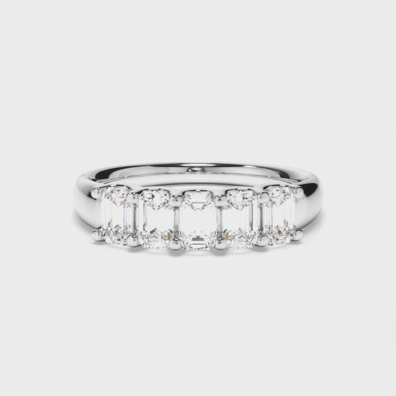 This stunning custom-made anniversary ring features five emerald cut diamonds set on an 18ct gold or platinum band. Exuding fluidity in its line work, and boasting an elegant silhouette, as with all the pieces in our Bespoke Collection, this piece is made especially for you.