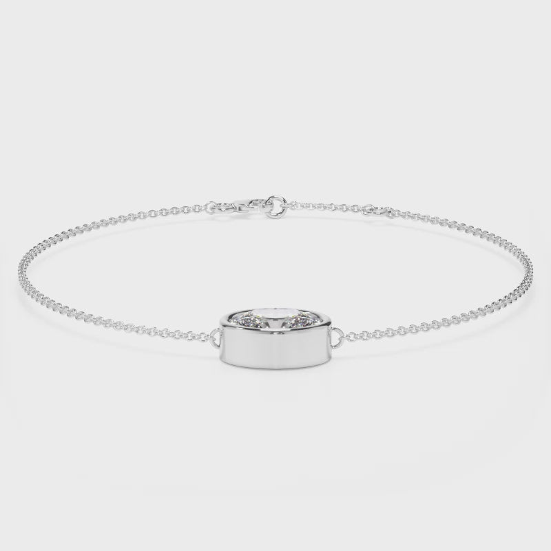This timeless bezel set diamond bracelet, made with your choice of diamond centre stone, features a 1.00ct oval cut laboratory-grown diamond set in 18ct gold. Exuding fluidity in its line work, and boasting an elegant silhouette, as with all the pieces in our Bespoke Collection, this piece is made especially for you.