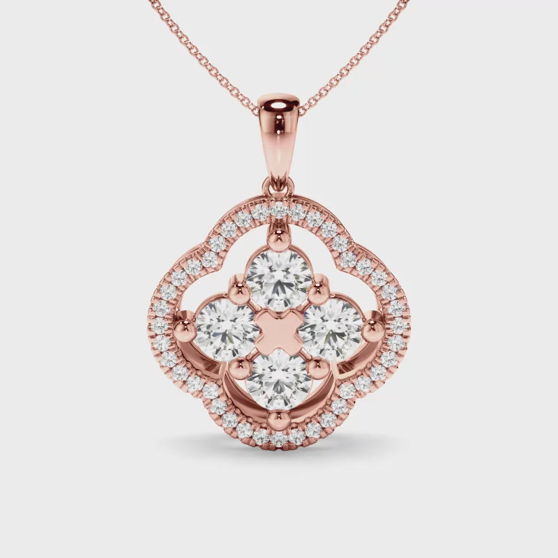 This elegant diamond feature pendant features four 0.25ct round brilliant cut diamonds with a 0.20ct round brilliant cut diamond halo in a clover-like design. Exuding fluidity in its line work, and boasting an elegant silhouette, as with all the pieces in our Bespoke Collection, this piece is made especially for you.