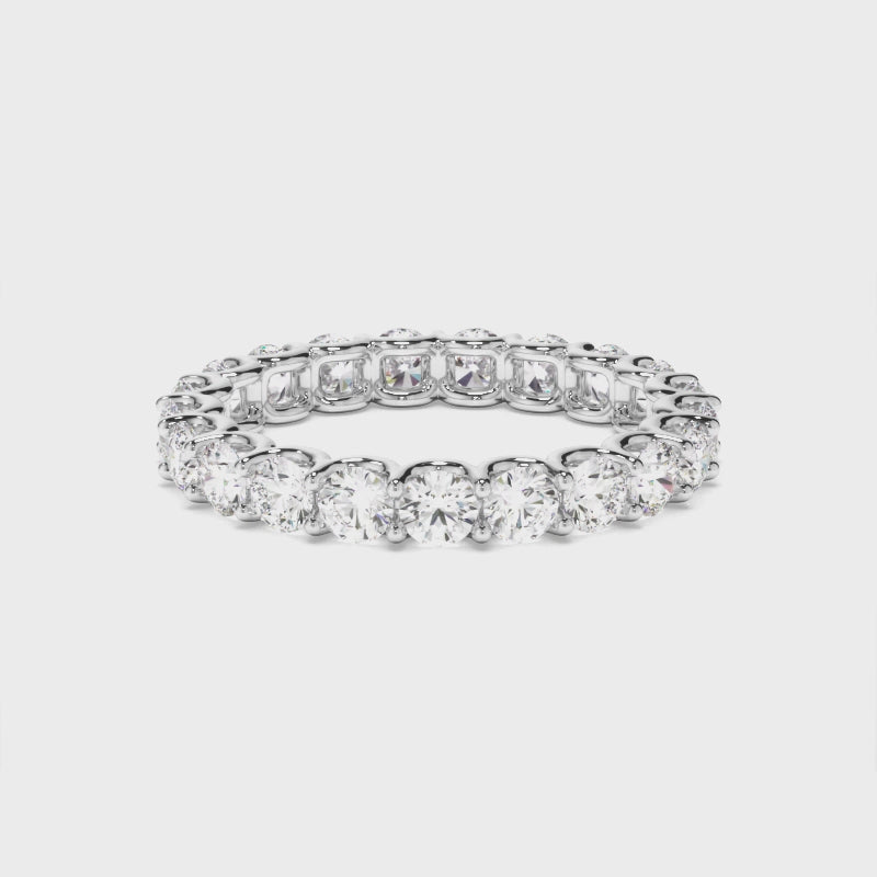 This stunning custom-made eternity ring features a full band of round brilliant cut diamonds set on an 18ct gold or platinum band. Exuding fluidity in its line work, and boasting an elegant silhouette, as with all the pieces in our Bespoke Collection, this piece is made especially for you.